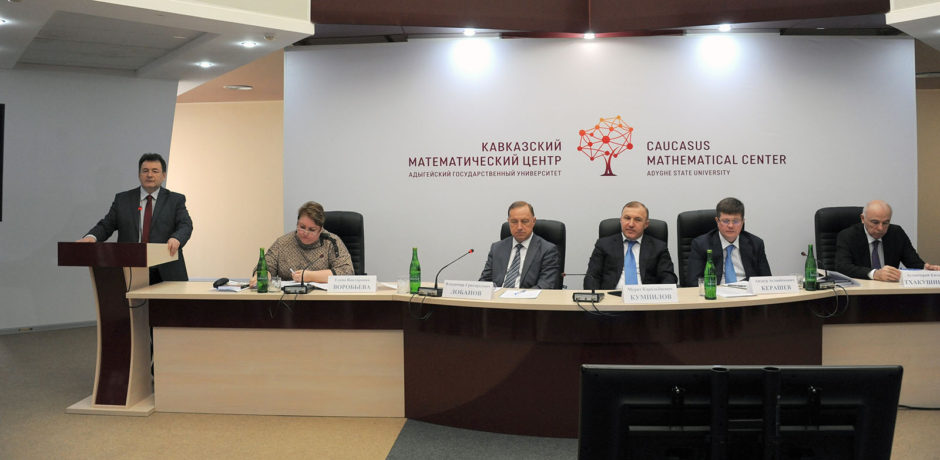 На заседании ректор АГУ Рашид Хунагов объявил об официальном открытии регионального научно-образовательного математического центра Адыгейского государственного университета – «Кавказский математический центр АГУ». Данный Центр является одним из шести математических центров, открывающихся по решению Министерства образования и науки РФ на базе Томского, Новосибирского, Казанского федерального, Южного федерального и Ярославского университетов. Все перечисленные университеты стали в 2017 году победителями конкурса Министерства образования и науки РФ и получили возможность открытия математических центров, благодаря потенциалу и предложенной программе развития математики и математического образования в вузе и регионе. По итогам конкурса научная команда факультета математики и компьютерных наук АГУ в партнерстве с Московским физико-техническим институтом получила грант на открытие «Кавказского математического центра АГУ» под научным руководством федерального профессора А.М.Райгородского. С декабря 2017 г. началась реализация данного проекта, цель которого – повышение уровня математических знаний школьников и студентов в регионе, подготовка на базе АГУ высокопрофессиональных кадров математиков и программистов по стандартам одного из лучших вузов страны – МФТИ.